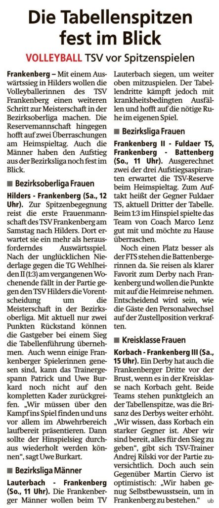 Die Tabellenspitzen fest im Blick von Viktor MünchFebruar 6, 2025Presse Bericht in der HNA Frankenberger Allgemeine