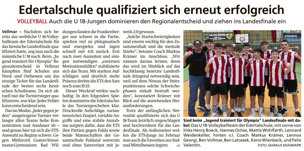 Edertalschule qualifiziert sich erneut erfolgreich von Viktor MünchDezember 18, 2025Dezember 18, 2025Presse Bericht in der HNA Frankenberger Allgemeine