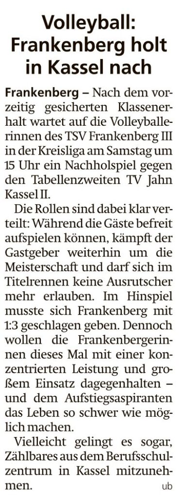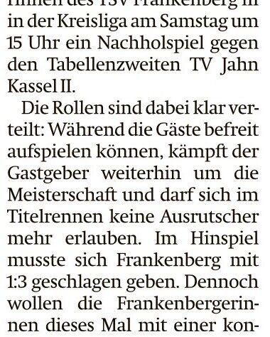 Frankenberg holt in Kassel nach von Viktor MünchFebruar 20, 2026Februar 23, 2026Presse Bericht in der HNA Frankenberger Allgemeine