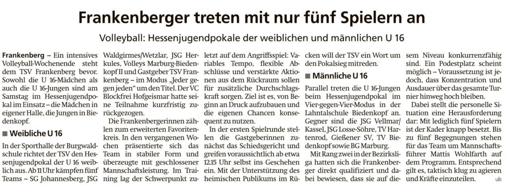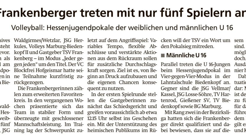 Frankenberger treten mit nur fünf Spielern an von Viktor MünchFebruar 20, 2026Februar 23, 2026Presse Bericht in der HNA Frankenberger Allgemeine