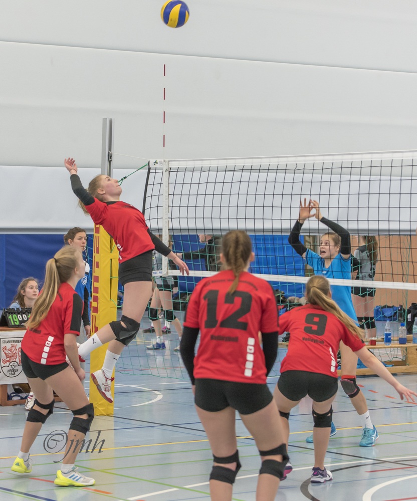Schon im ersten Vorrunden-Spiel gegen die Zweite des VC Wiesbaden fiel die Vorentscheidung um den Einzug ins Halbfinale. Nach dem kurzfristigen Ausfall von Mittelblockerin Paula Schuchard, konnte man zwar nicht in Bestbesetzung in die Partie gehen. Trotzdem zeigten die Gastgeberinnen von Anfang an eine eindrucksvolle Vorstellung. Bis zum 20:20 waren beide Teams gleichauf. Erbittert wurde um jeden Punkt gekämpft. Auf Frankenberger Seite trumpfte vor allem Juliane Zink mit starken Angriffen und guter Blockarbeit auf, konnte am Ende aber den knappen Satzverlust zum 21:25 nicht verhindern. Auch im zweiten Satz hielten die Gastgeberinnen lange mit, mussten sich am Ende den Kaderspielerinnen aus Wiesbaden aber mit 19:25 geschlagen geben.