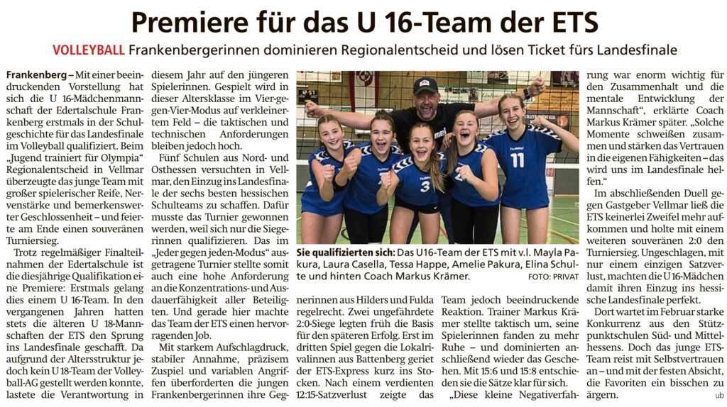 Premiere für das U16-Team der ETS von Viktor MünchDezember 6, 2025Dezember 8, 2025Presse Bericht in der HNA Frankenberger Allgemeine