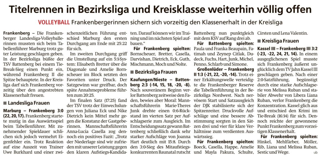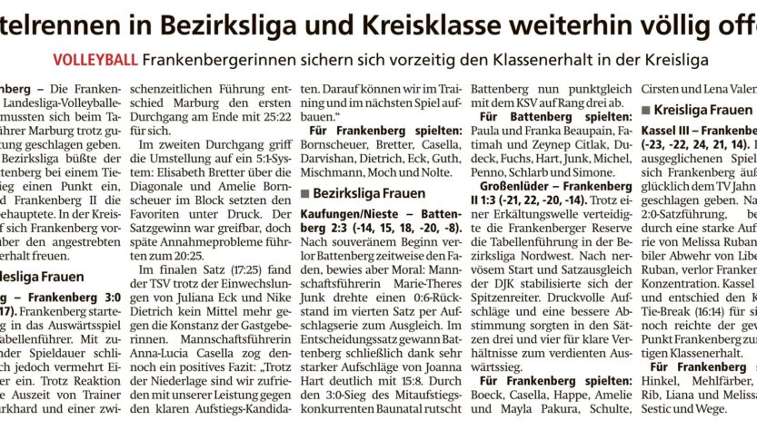 Titelrennen in Bezirksliga und Kreisklasse weiterhin völlig offen von Viktor MünchFebruar 16, 2026Februar 16, 2026Presse Bericht in der HNA Frankenberger Allgemeine