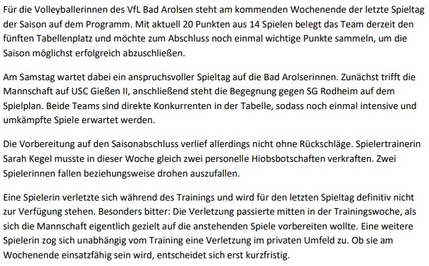 Trotz der personellen Unsicherheiten blickt der VfL Bad Arolsen motiviert auf die abschließenden Partien der Saison. Das Team möchte noch einmal geschlossen auftreten und die Spielzeit mit einer engagierten Leistung beenden.